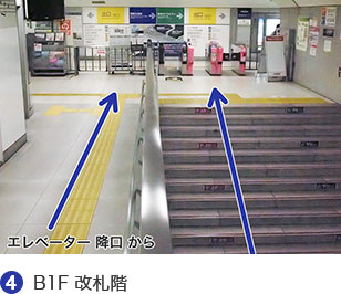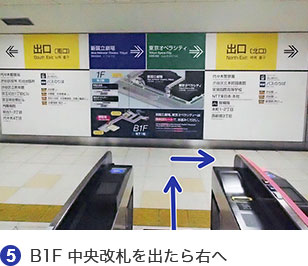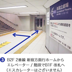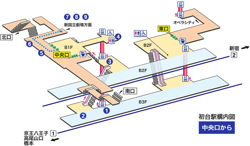 紺色の「新国立劇場」の表示に沿って、階段、エスカレーター、またはエレベーターでB1Fにある中央口改札へお進みください。