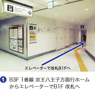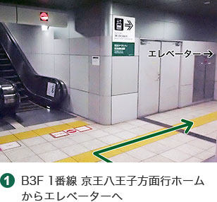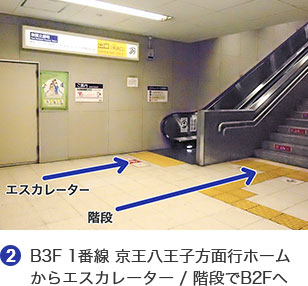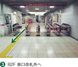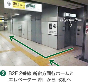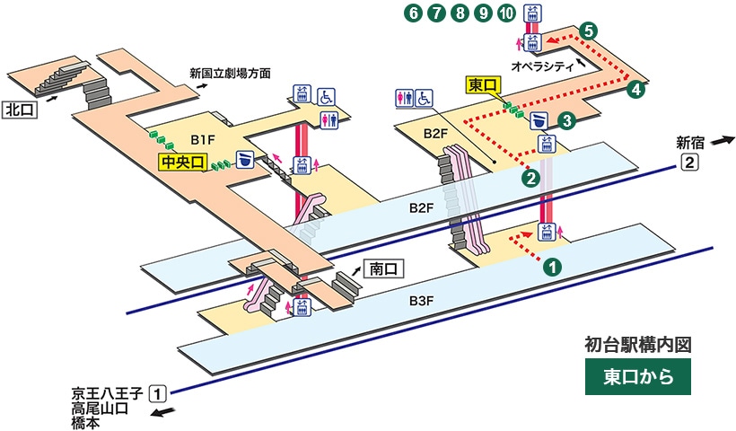 緑色の「東京オペラシティ」の表示に沿って、エレベーターでB2Fにある東口改札へお進みください。
