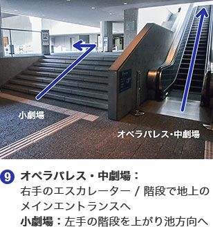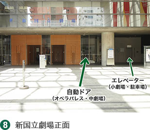 - 劇場へのエレベーターをご利用の際、小劇場へは地下1階でお降りください。オペラパレス、中劇場へは1階で降り、メインエントランスから館内へご入場ください。