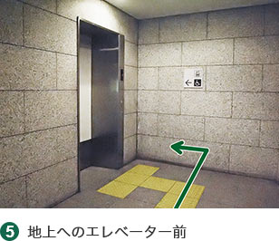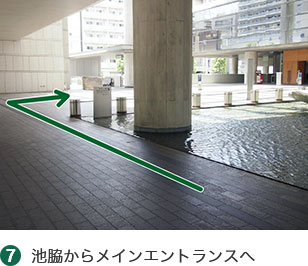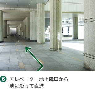エレベーターで地上へお進みください。地上に出たら池に沿って直進してください。