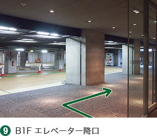 右側の駐車場行きエレベーターでB1Fへお進みください。