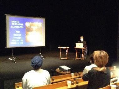 ▲しいの実シアターの代表・園山土筆さんの特別講義 ▲しいの実シアター見学(舞台上)