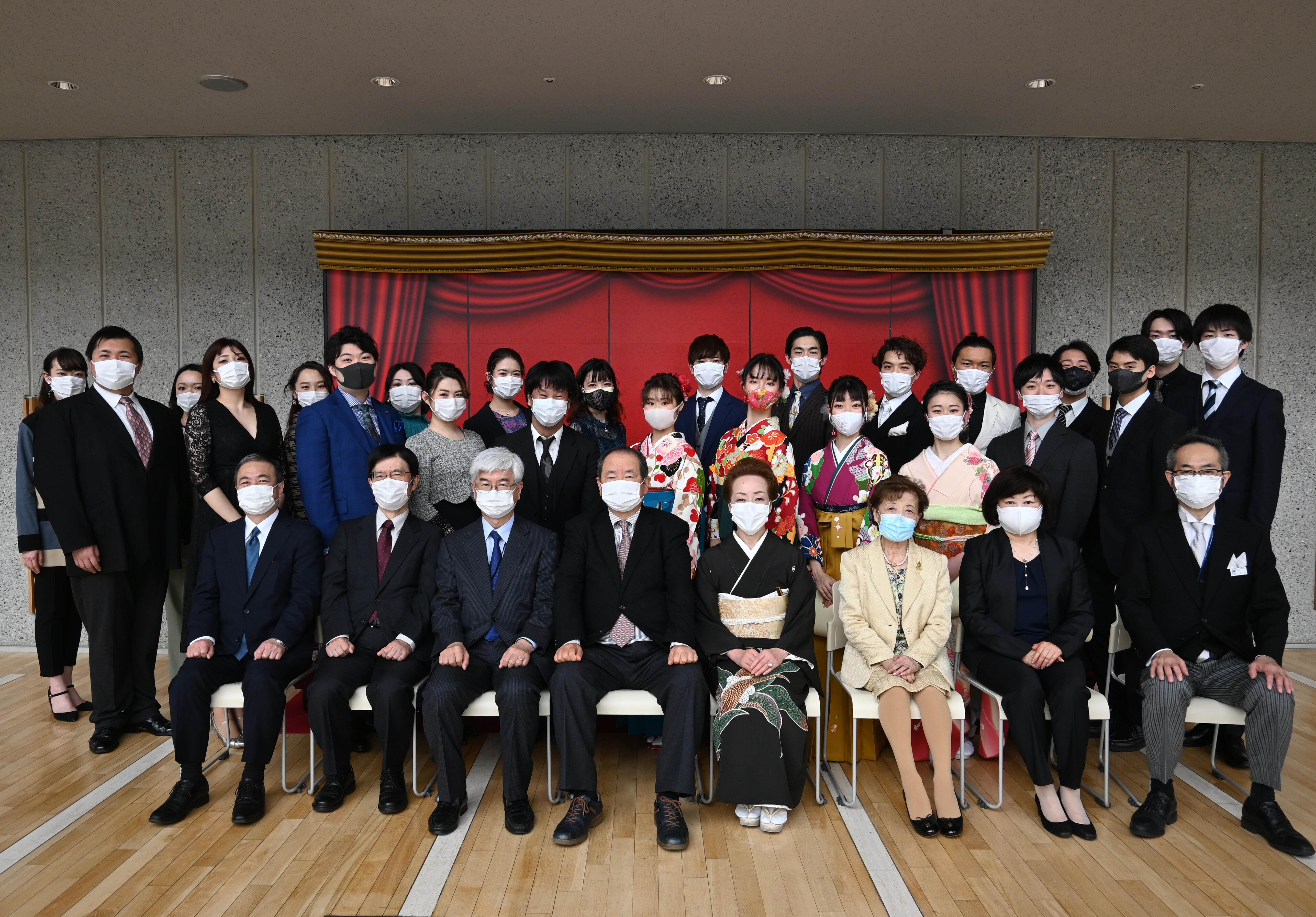 ▲記念撮影(1列目左より)田栗常務理事、今井常務理事、村田常務理事、尾﨑理事長、永井オペラ研修所長、
