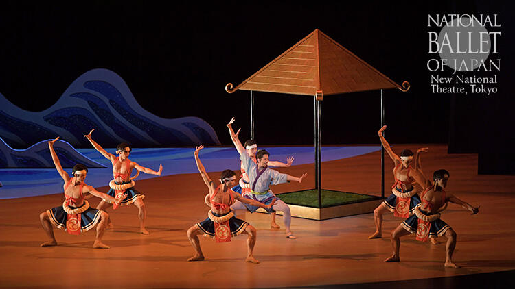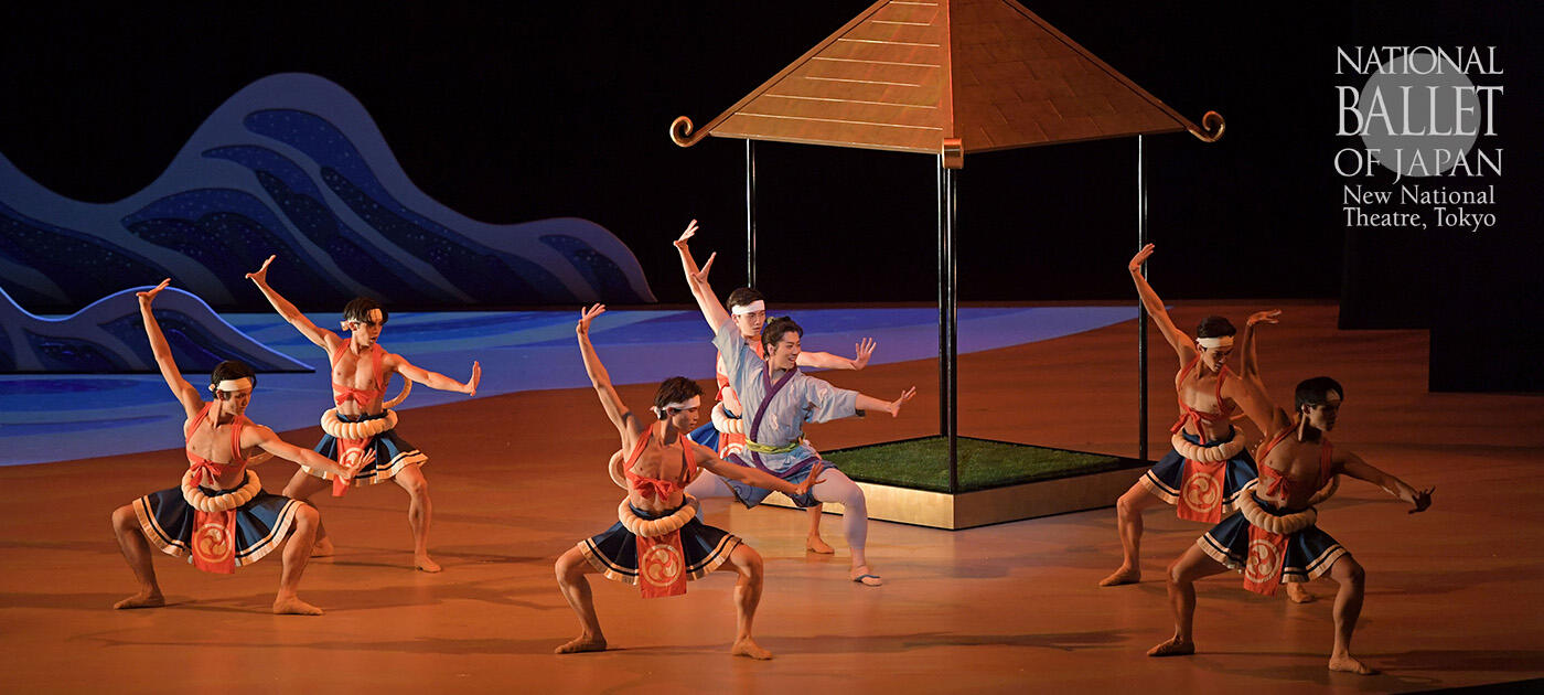 そして太郎は鶴に姿を変え、大空に飛び立ちます。風を切り、光を放ち、空を飛ぶ明神となった太郎。「あの時みた夢は、このことだったのか!」そこへ、亀の神となった亀の姫があらわれます。亀の姫は鶴の浦島太郎とともに、この島の