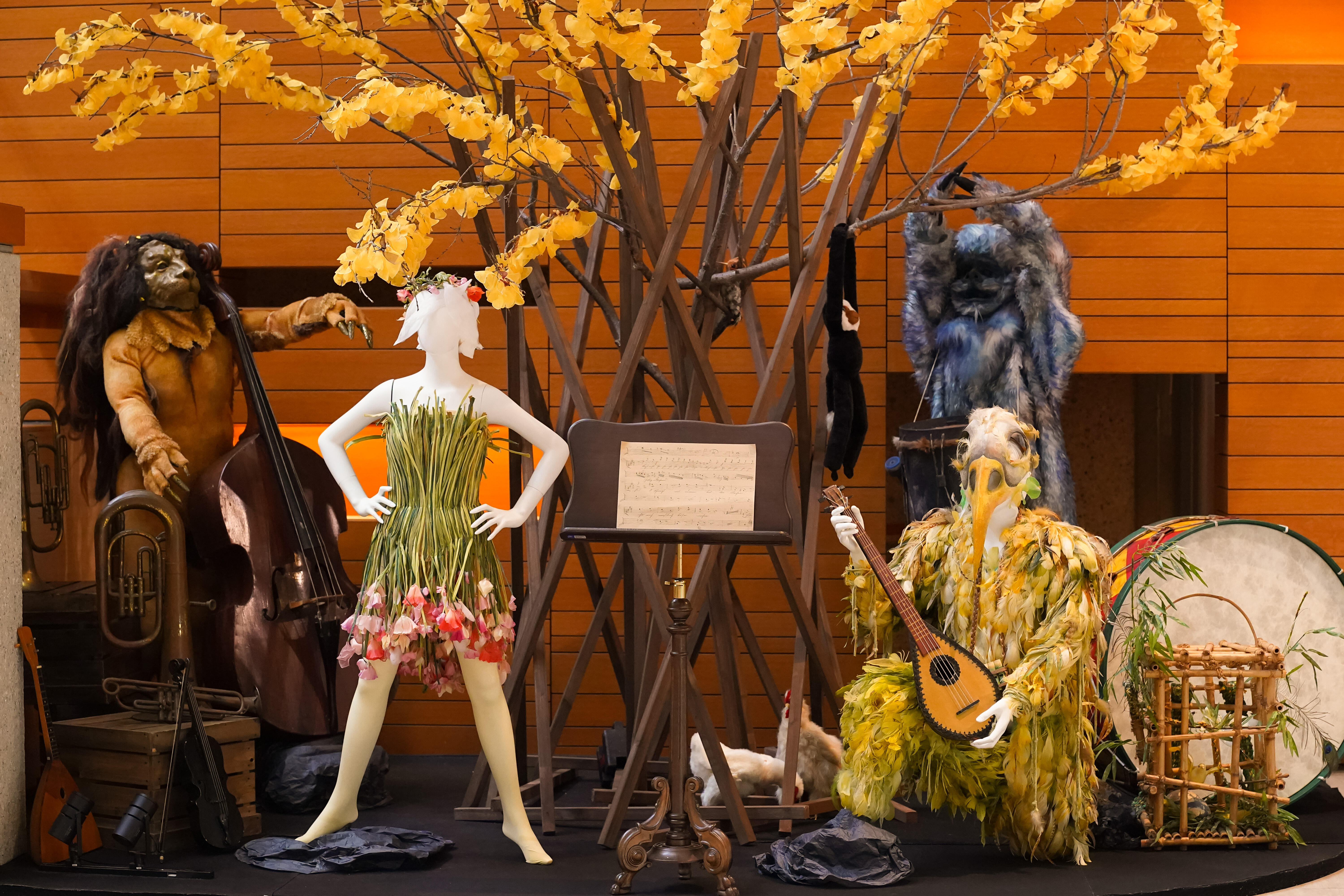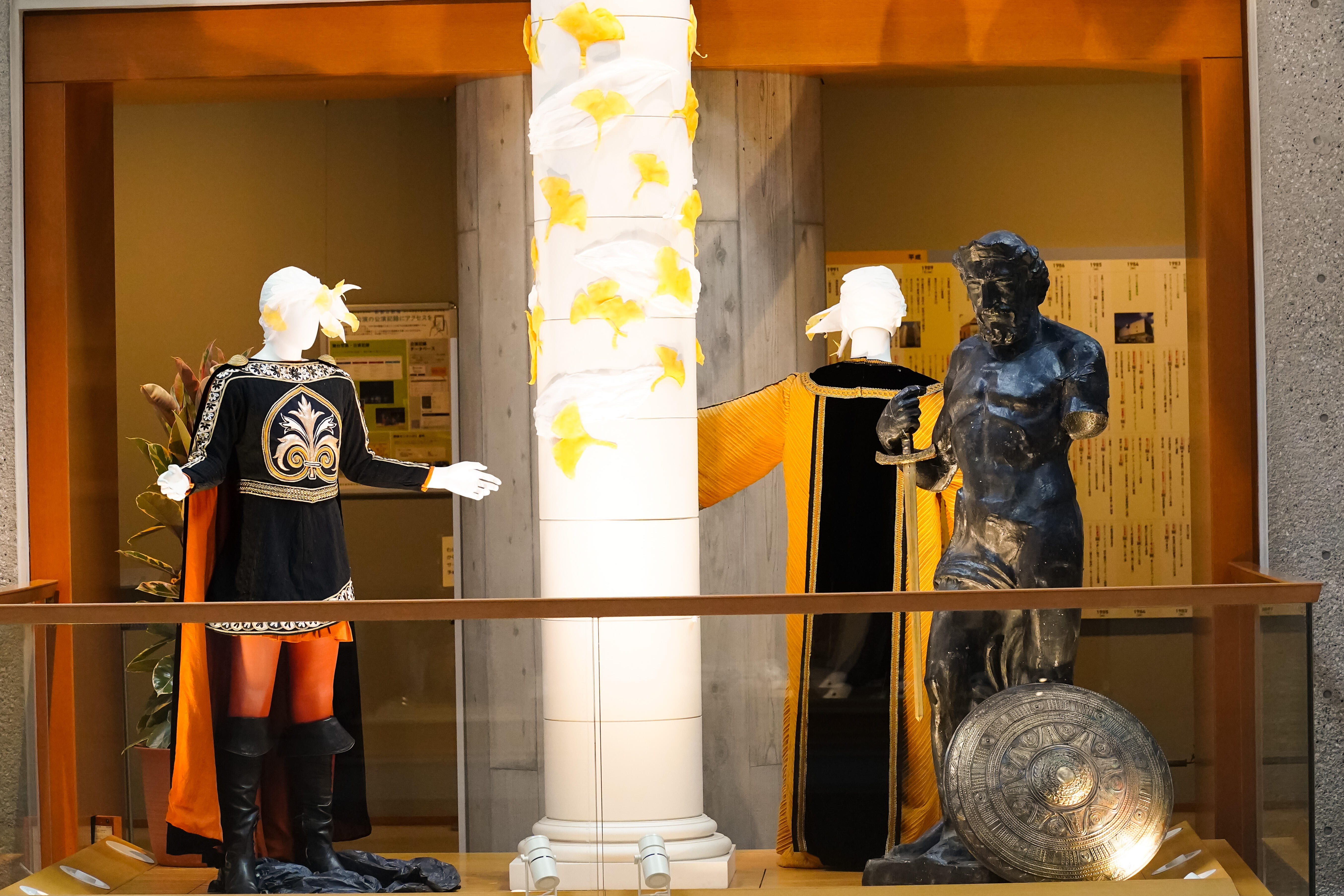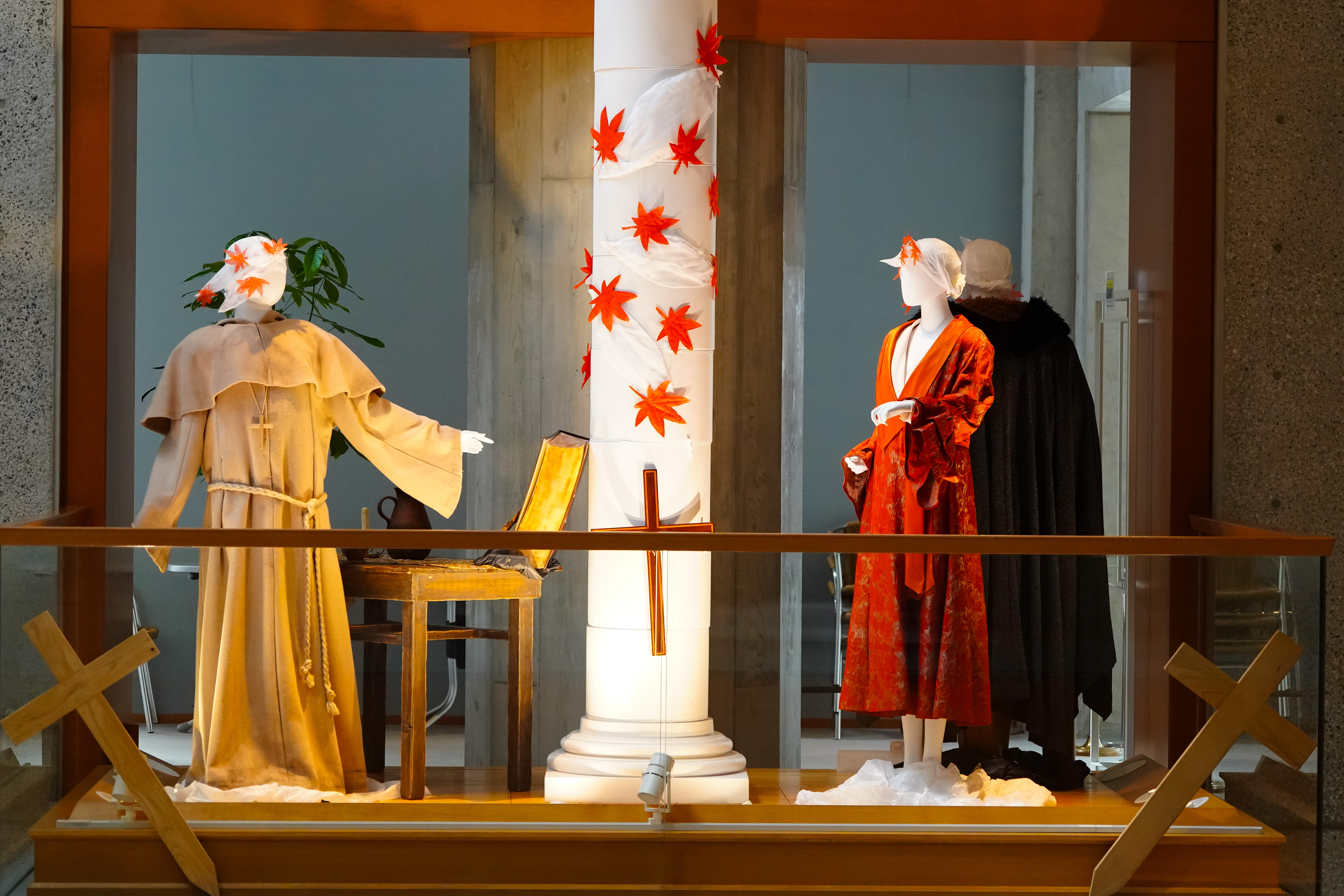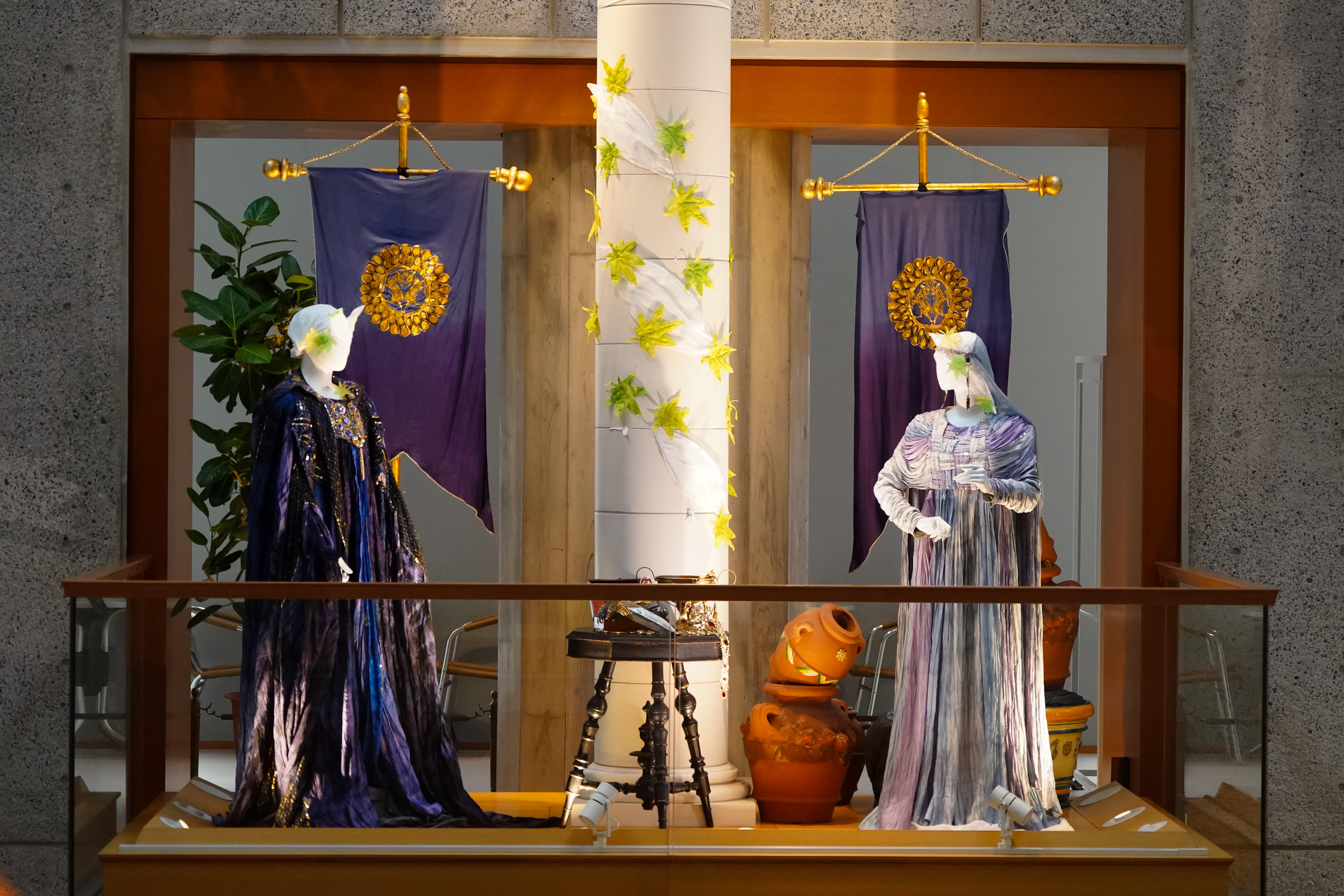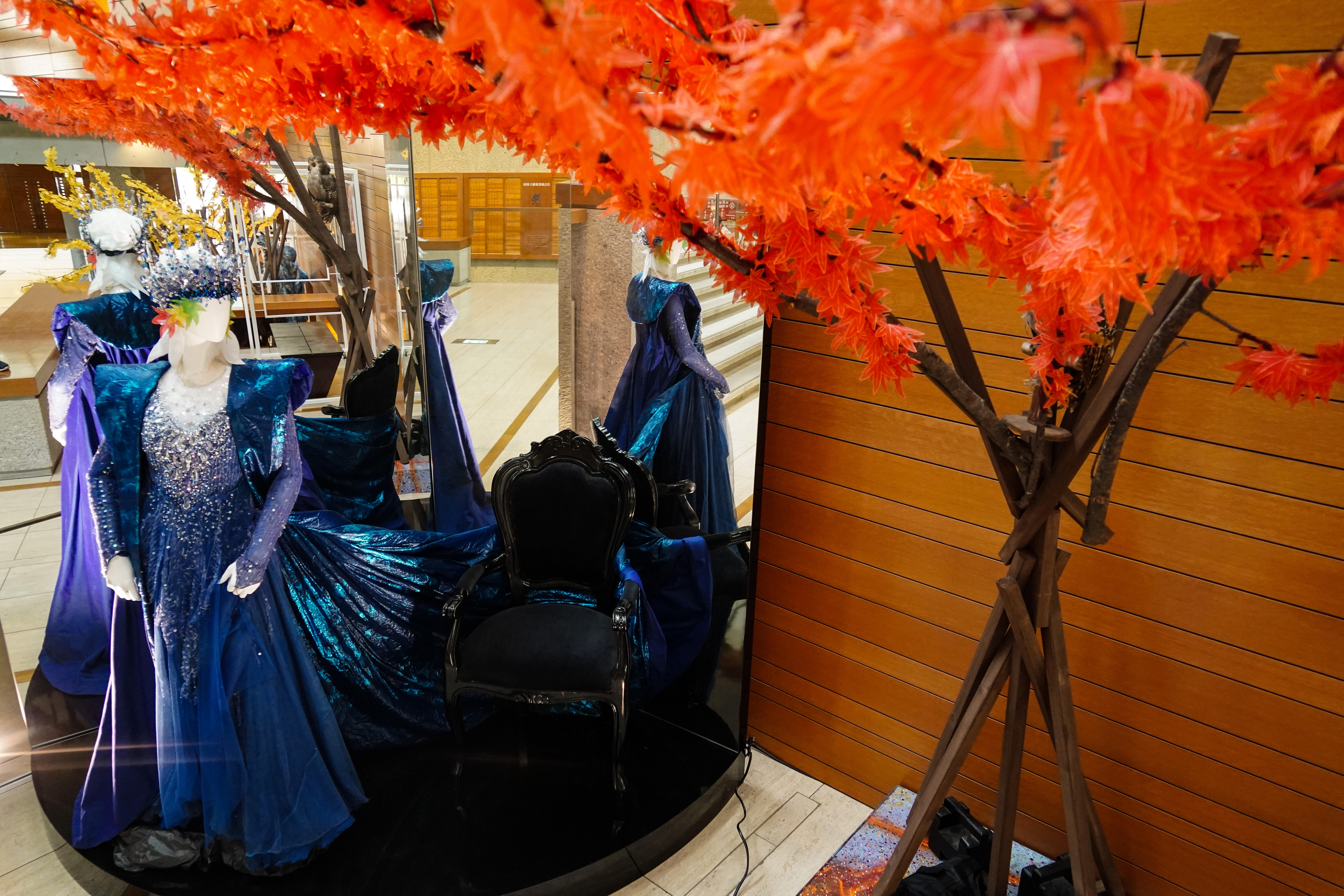 今回の展示では、オペラ『魔笛』(1998年初演)、『蝶々夫人』(1998年初演)、『長門美保歌劇団寄贈・蝶々夫人衣裳』、『パルジファル』(2014年初演)、 『ナブッコ』(1998年初演)、『イル・トロヴァトーレ』(2011年初演)、『運命の力』(2006年初演)、『イドメネオ』(2006年初演)、『マクベス(2004年初演』、『ジークフリート』(2003年初演)、バレエ『シンデレラ』(1999年初演)から、美しい衣裳の数々を、彩ゆたかな空間にご紹介しています。メインモチーフの紅葉とイチョウは約6,000枚からなり、1枚1枚が刺繍をはじめとする手仕事によるものです。