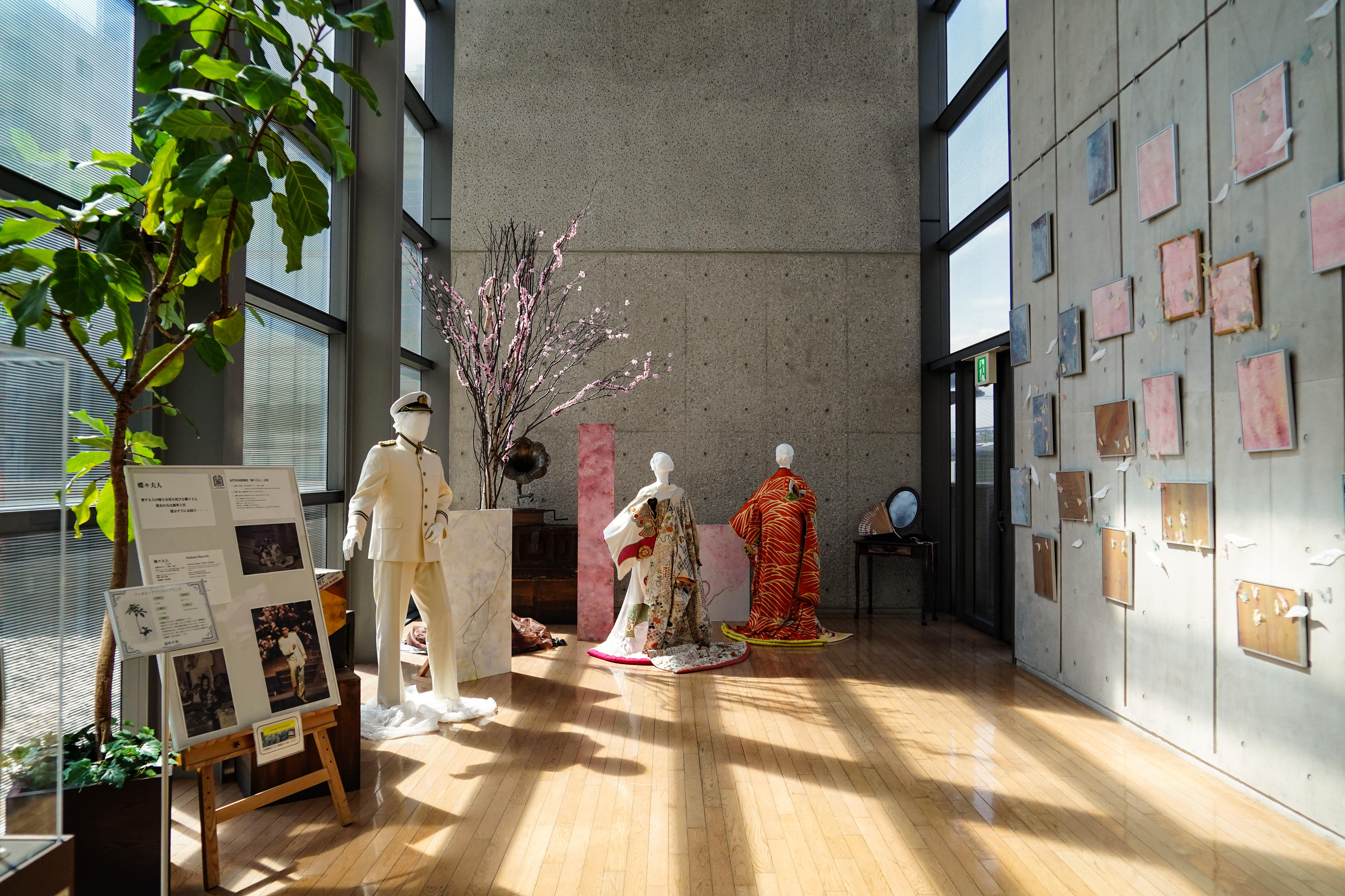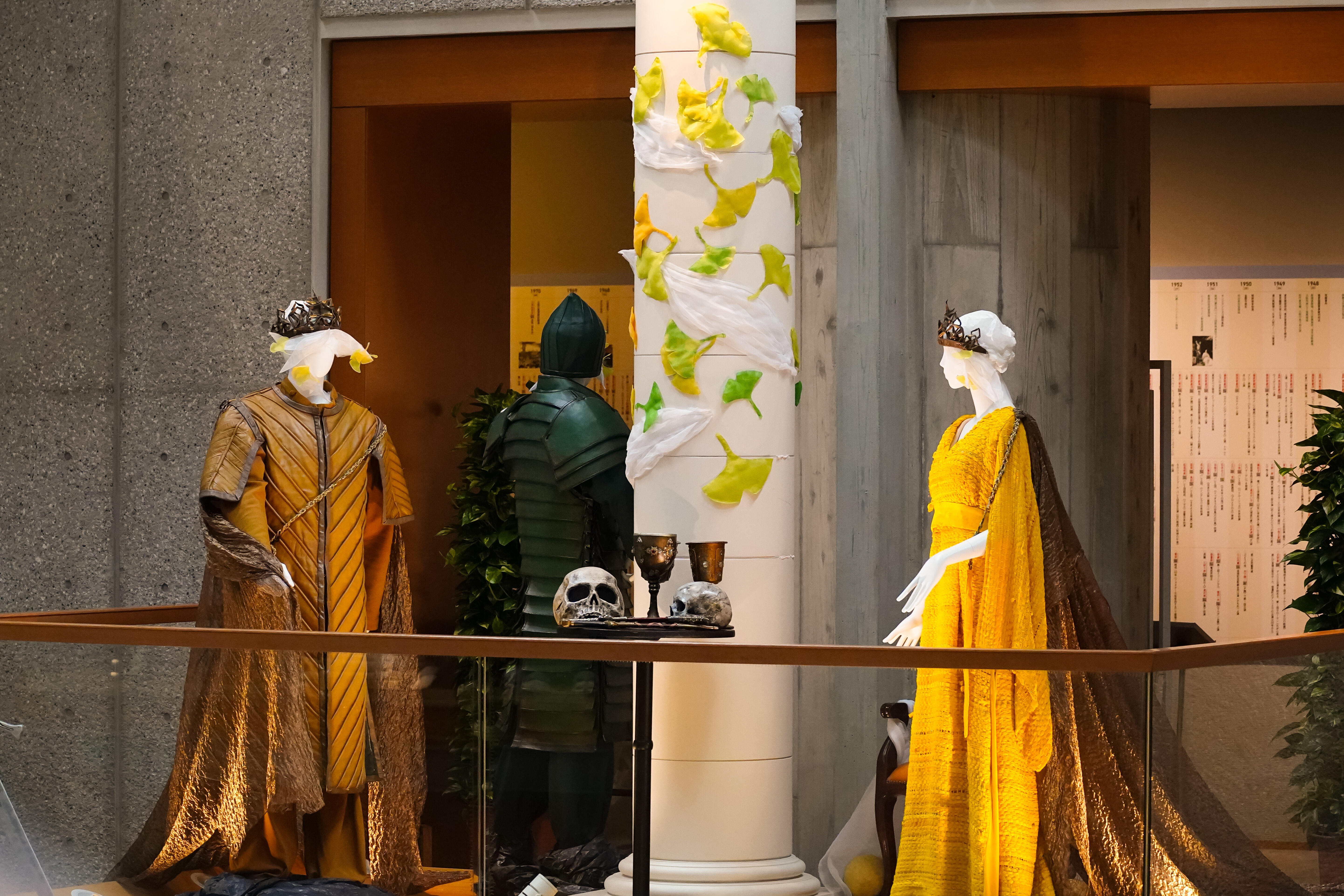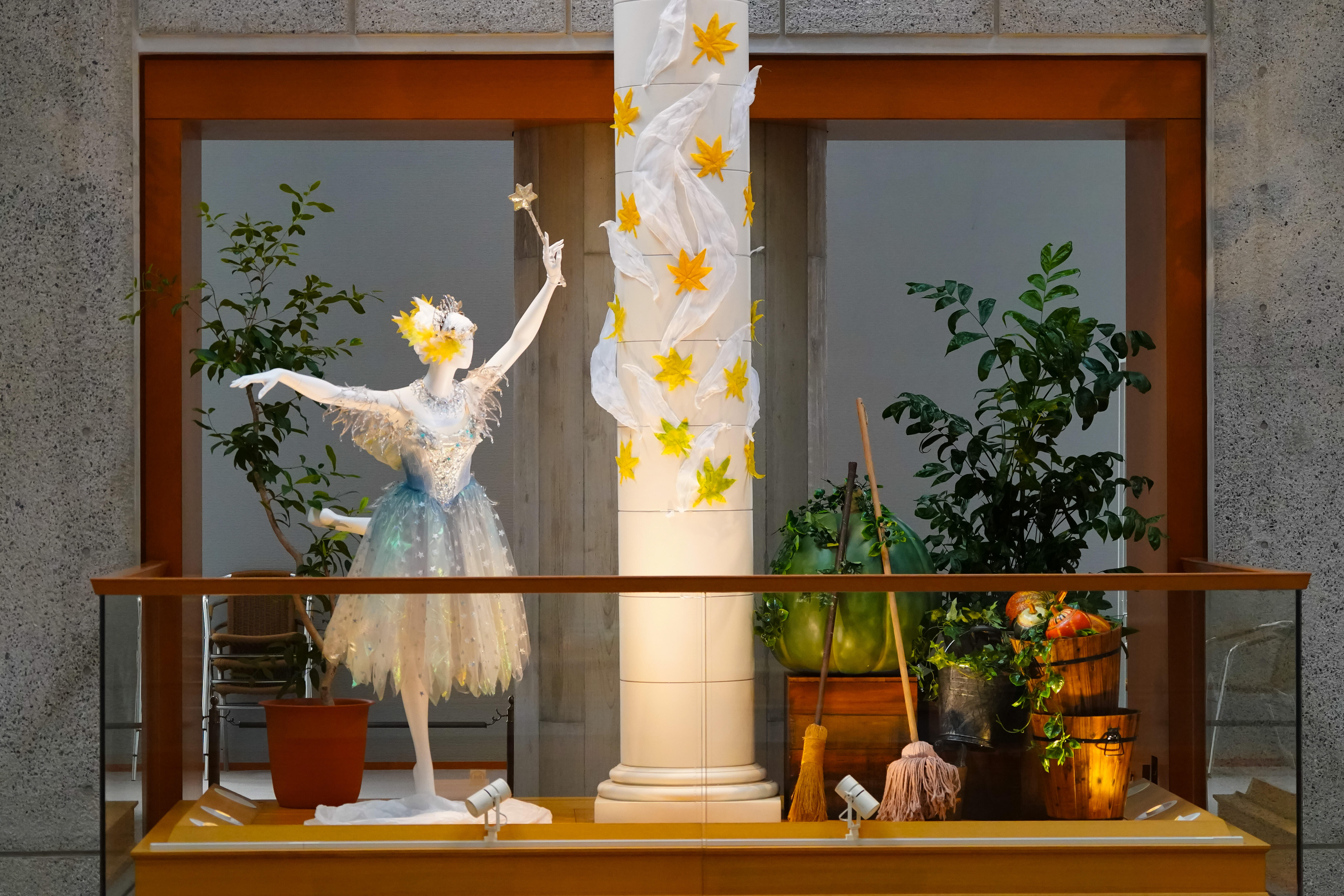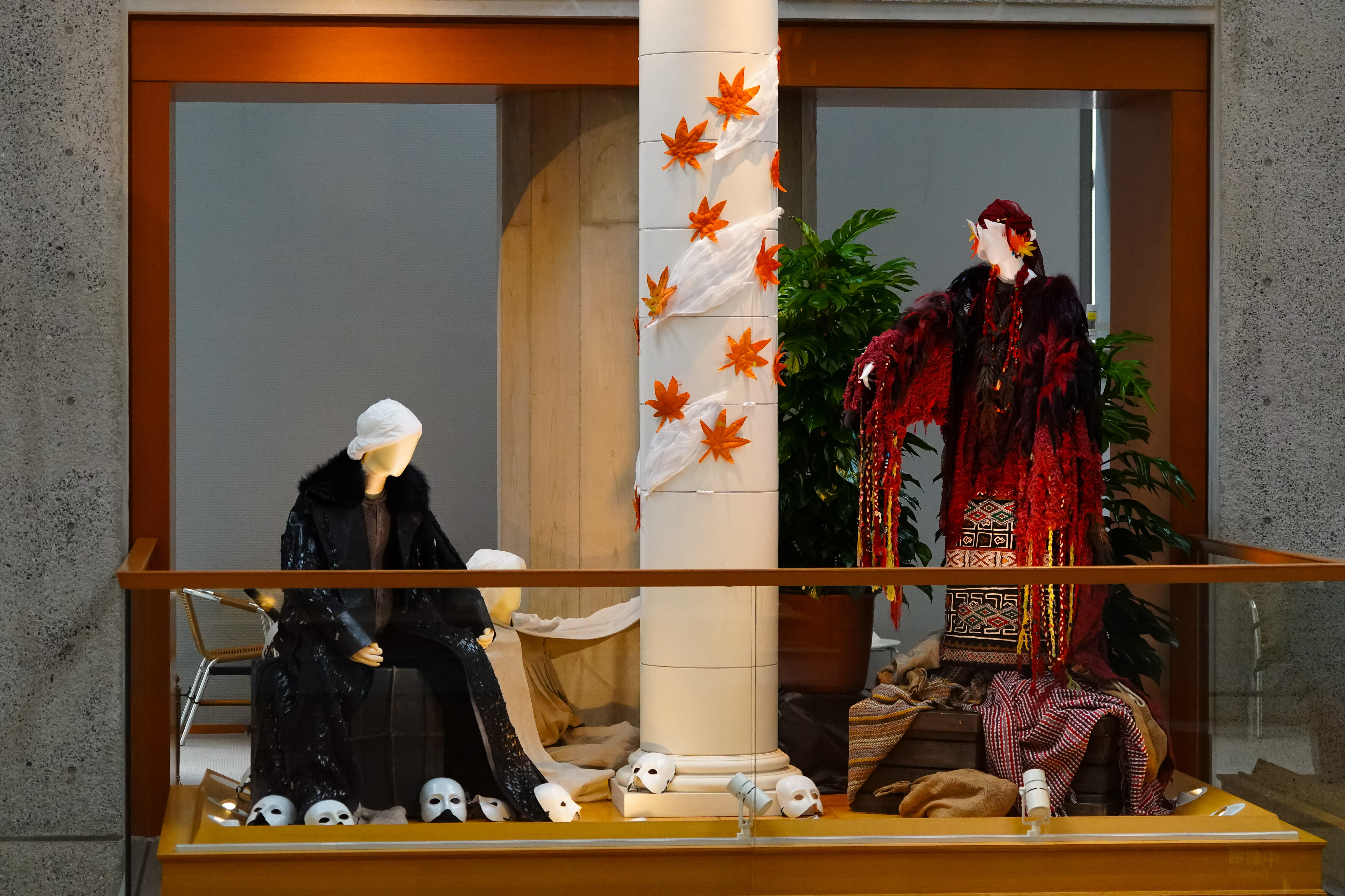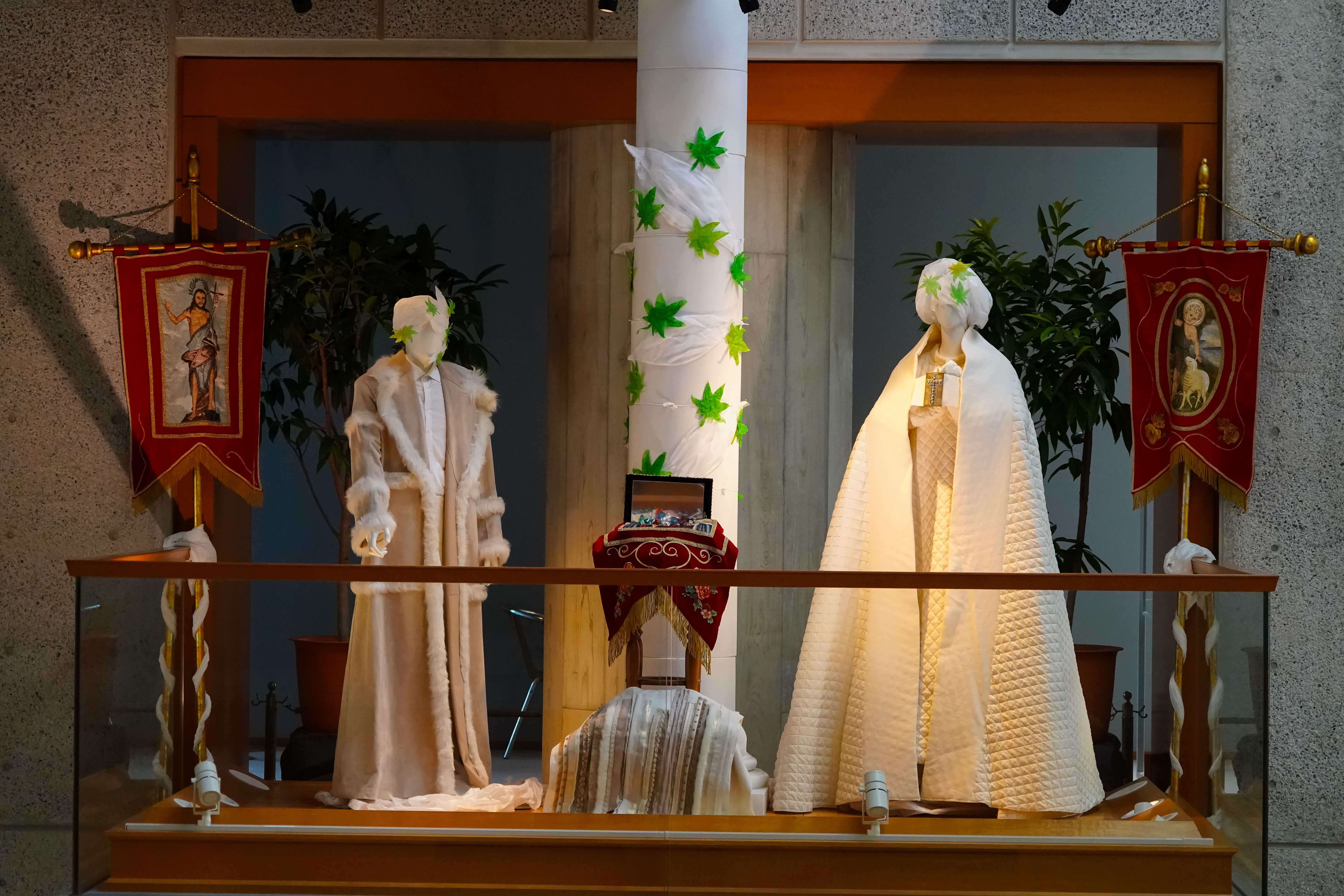 今回の展示では、オペラ『魔笛』(1998年初演)、『蝶々夫人』(1998年初演)、『長門美保歌劇団寄贈・蝶々夫人衣裳』、『パルジファル』(2014年初演)、 『ナブッコ』(1998年初演)、『イル・トロヴァトーレ』(2011年初演)、『運命の力』(2006年初演)、『イドメネオ』(2006年初演)、『マクベス(2004年初演』、『ジークフリート』(2003年初演)、バレエ『シンデレラ』(1999年初演)から、美しい衣裳の数々を、彩ゆたかな空間にご紹介しています。メインモチーフの紅葉とイチョウは約6,000枚からなり、1枚1枚が刺繍をはじめとする手仕事によるものです。