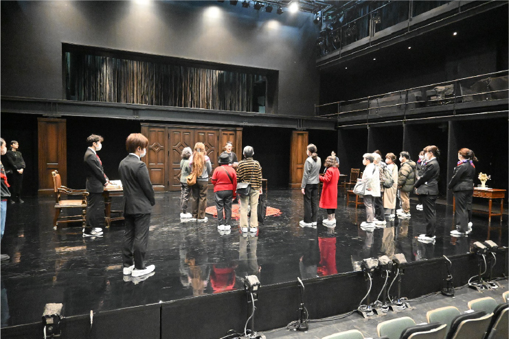 1つ目の事前説明会では、劇場の中で舞台の形状、セットの形や配置などを説明し、実際に舞台の上に立って歩いたり、小道具や衣裳に触れてもらったりという体験を行っています。