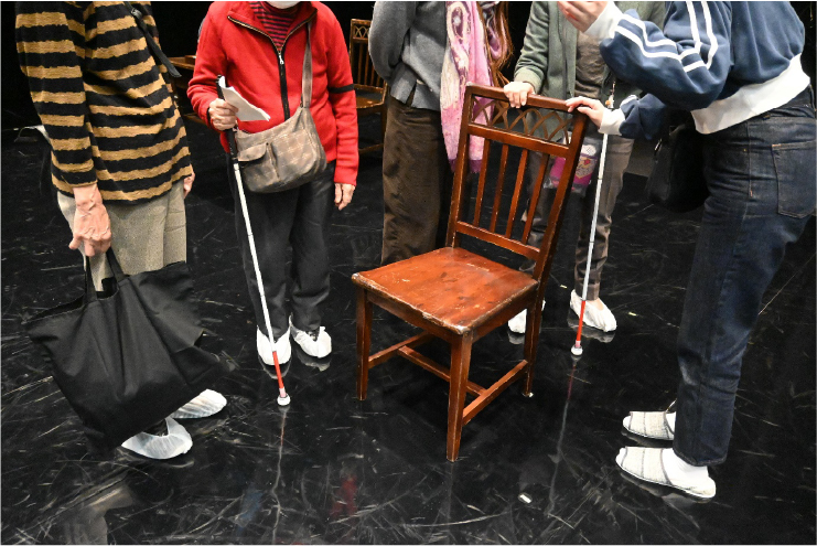 6回やってきたことで、何が情報として必要なのかについては、ある程度見えてきてはいるんですが、僕自身は晴眼者なので確信を持てない部分があり、そこが一番むずかしいところです。初期段階から手伝ってもらっている、演劇を学んだ視覚障がい者の方がいるので、「どこがわからなかった?」とか、「どういう情報があったらもっと想像しやすいだろう?」といったことを具体的に相談しながら進めています。説明をしたり、舞台装置、衣裳、小道具などに実際に触っていただいたりしているときに、「そういう世界観なのね」「こういう質感なんだ」と感想が聞けたり、これから観劇する世界をわくわくしながら受け取ってもらえている瞬間に立ち会えたりすると、とてもうれしく感じます。