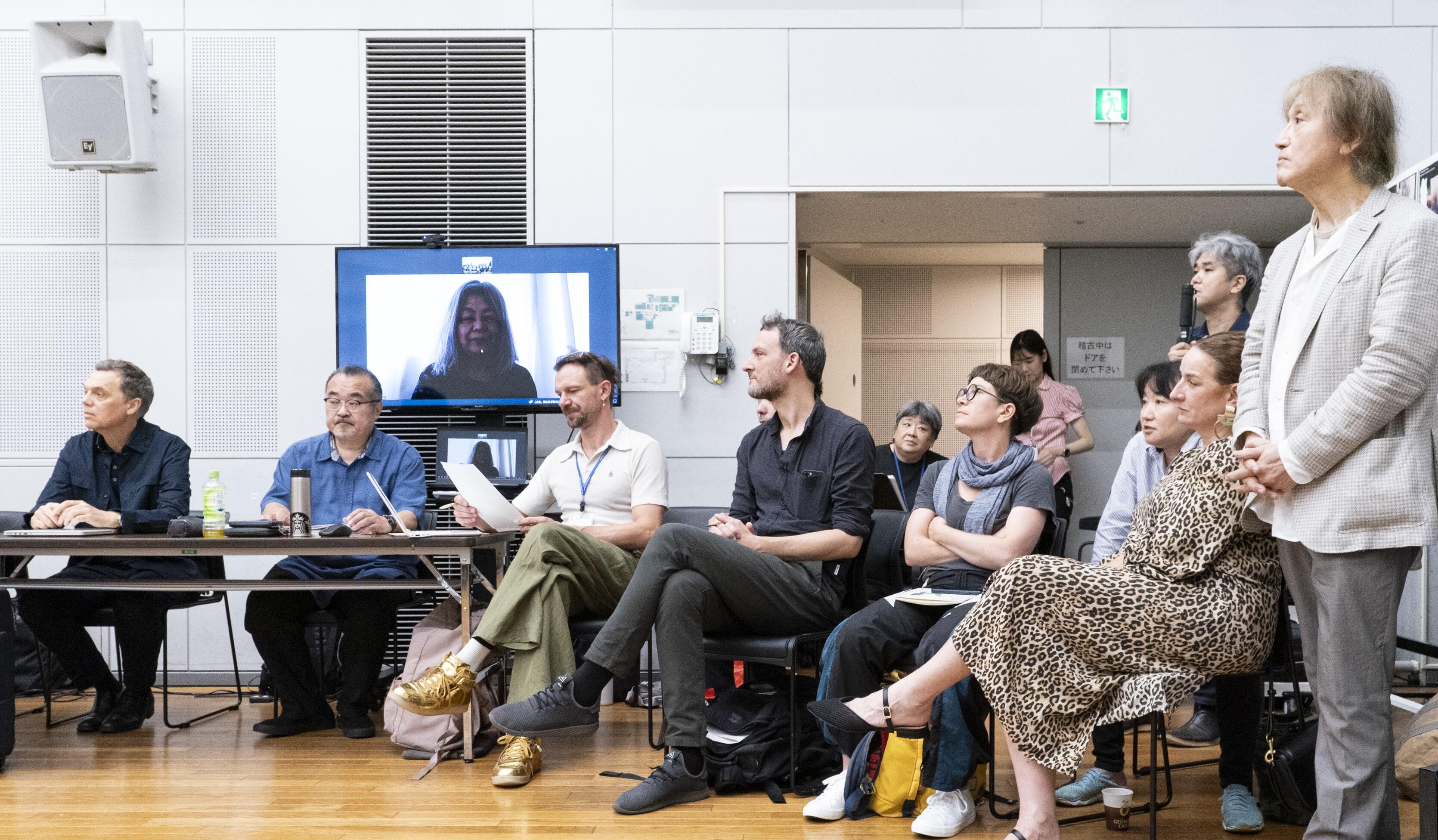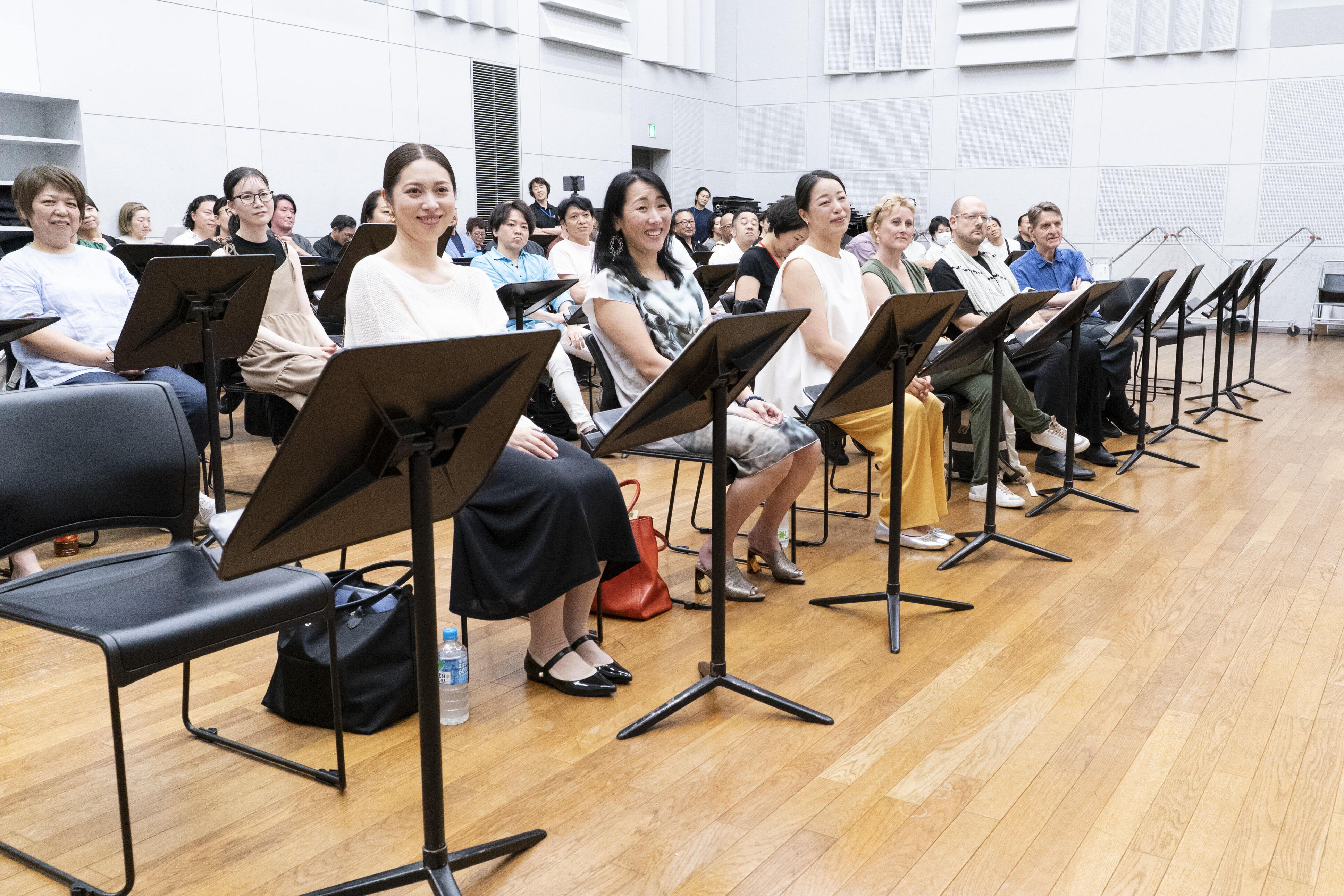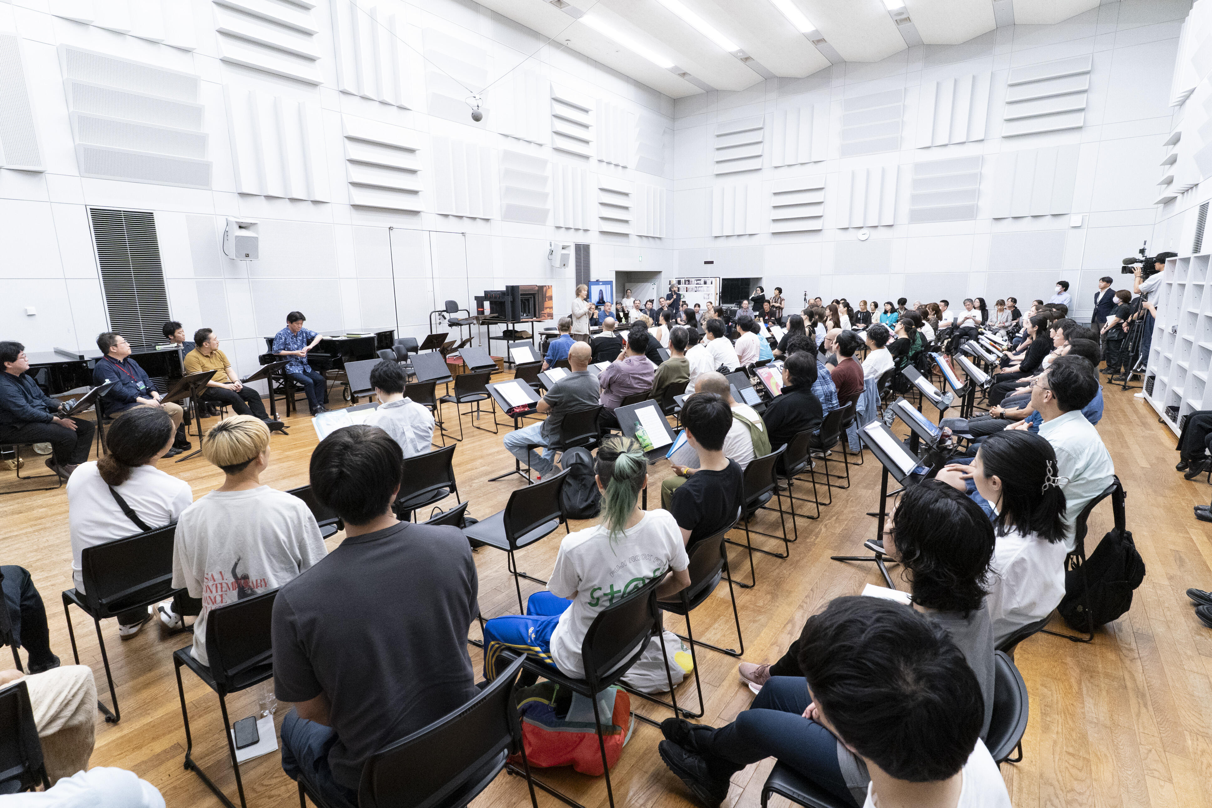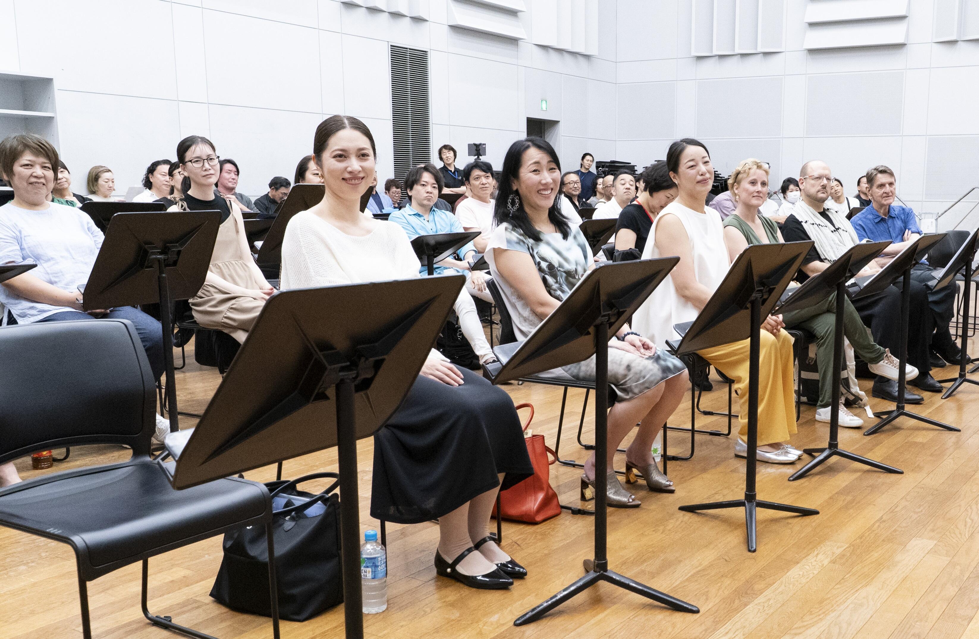 新国立劇場リハーサル室には、『ナターシャ』を作曲した細川俊夫、この作品を指揮する大野和士オペラ芸術監督、演出家のクリスティアン・レートをはじめ続々と来日したクリエイティブ・スタッフ、電子音響の有馬純寿、キャストとダンサー・助演、新国立劇場合唱団が一堂に会し、台本の多和田葉子もベルリンからリモートで参加して、顔合わせが行われました。