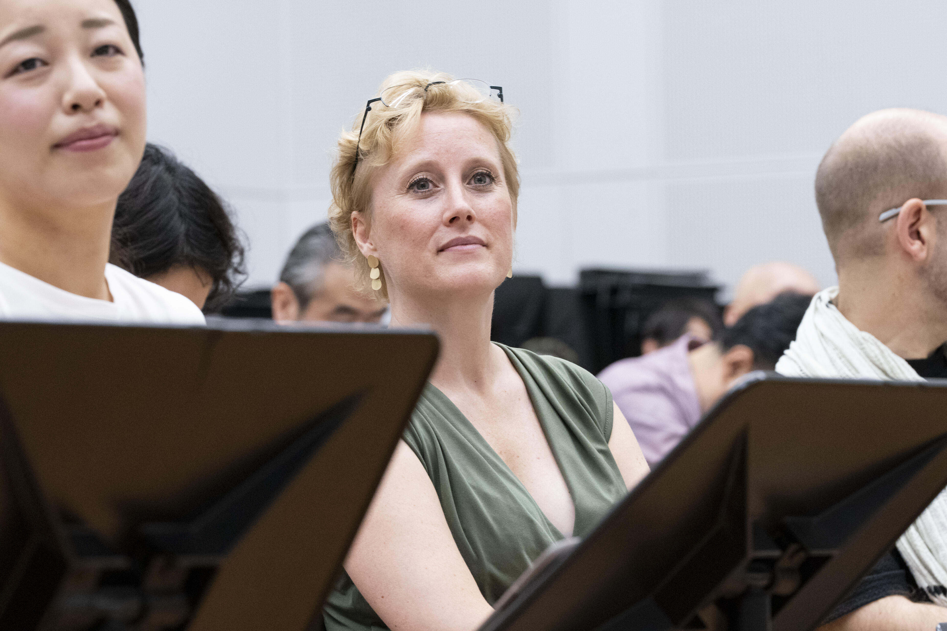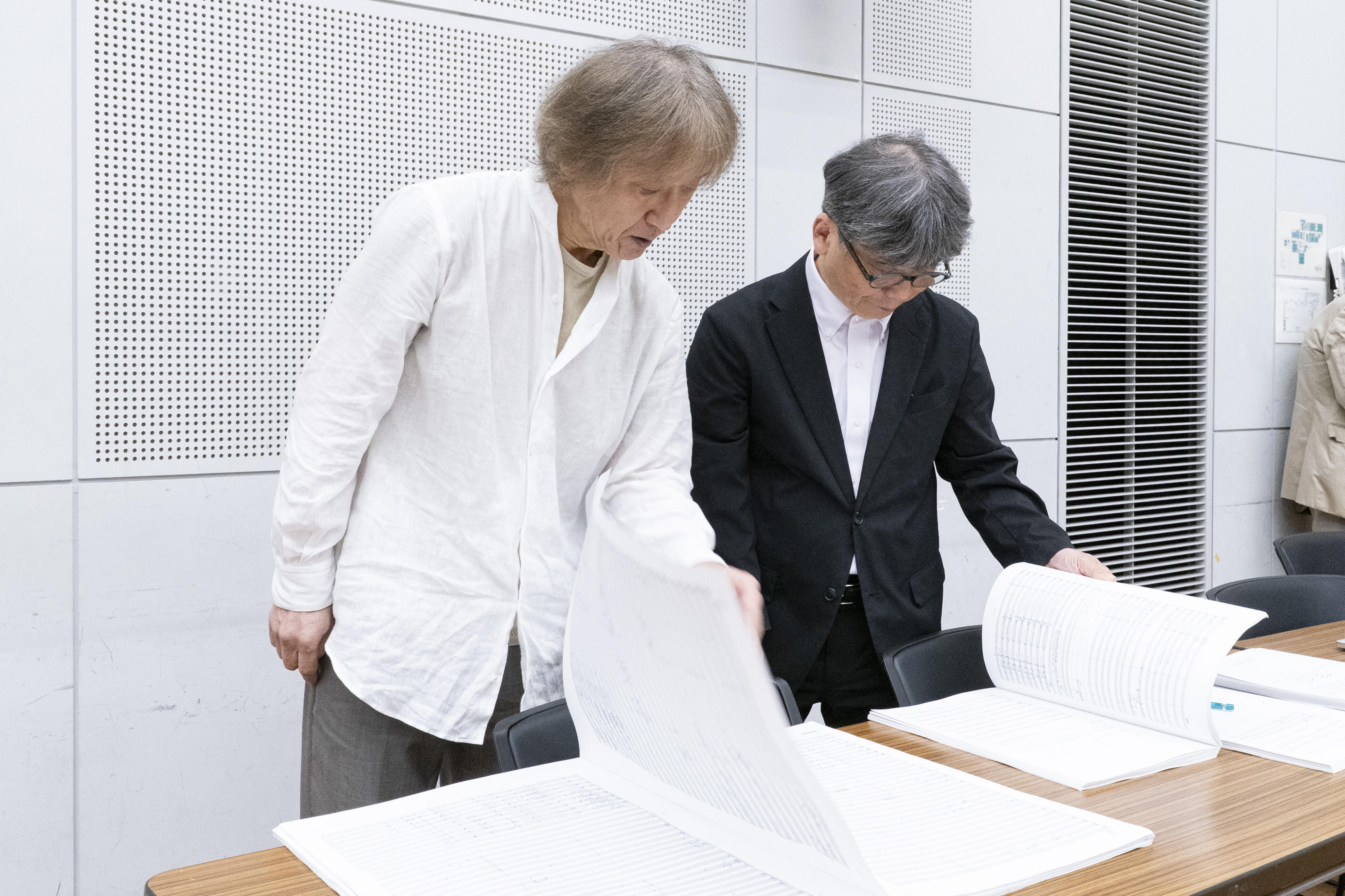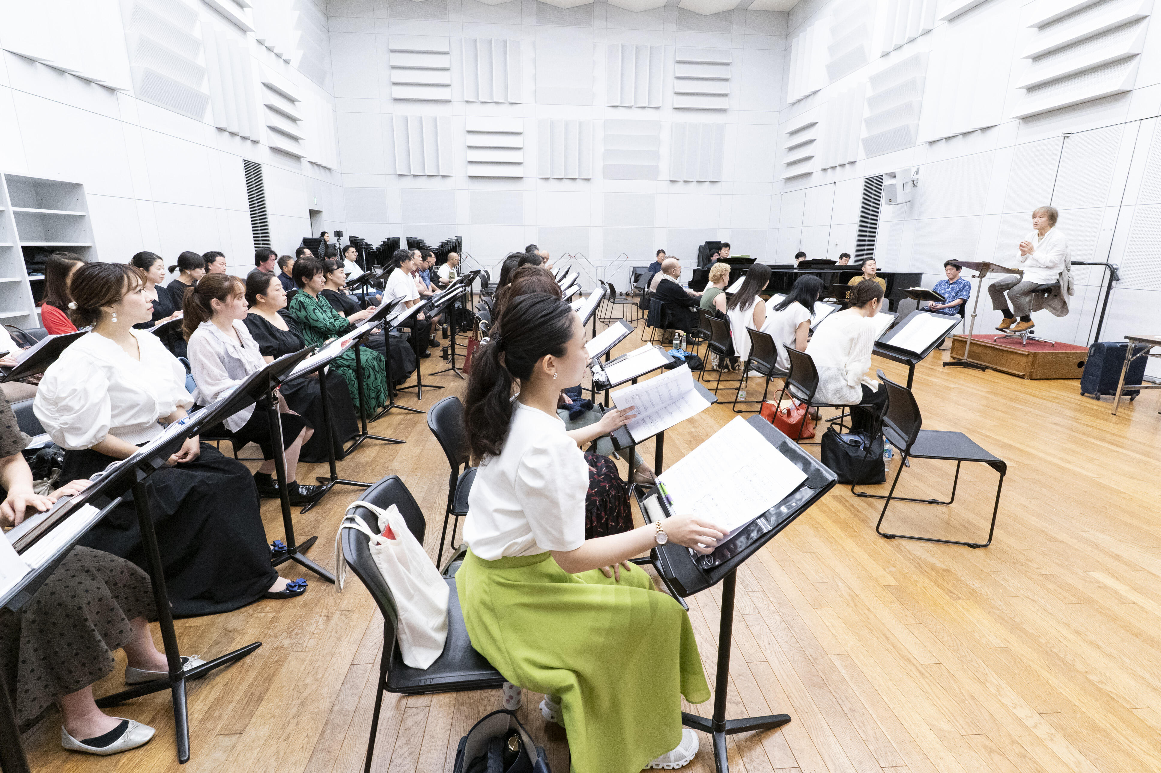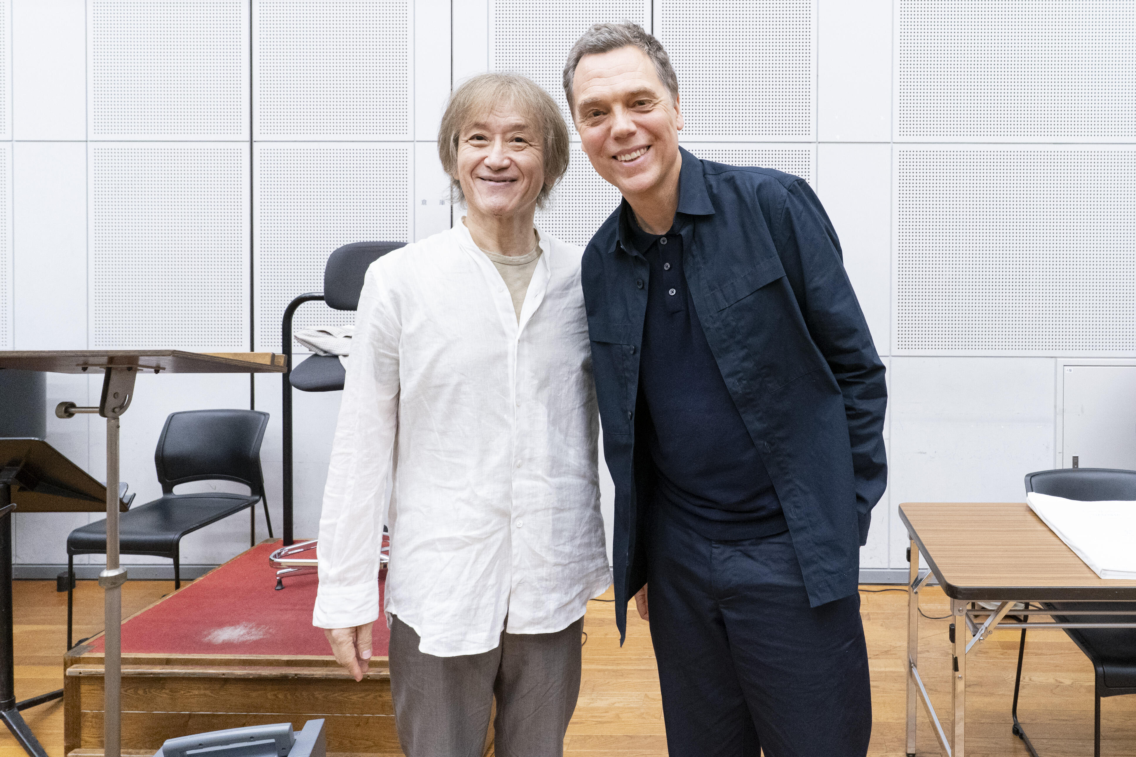 新国立劇場リハーサル室には、『ナターシャ』を作曲した細川俊夫、この作品を指揮する大野和士オペラ芸術監督、演出家のクリスティアン・レートをはじめ続々と来日したクリエイティブ・スタッフ、電子音響の有馬純寿、キャストとダンサー・助演、新国立劇場合唱団が一堂に会し、台本の多和田葉子もベルリンからリモートで参加して、顔合わせが行われました。