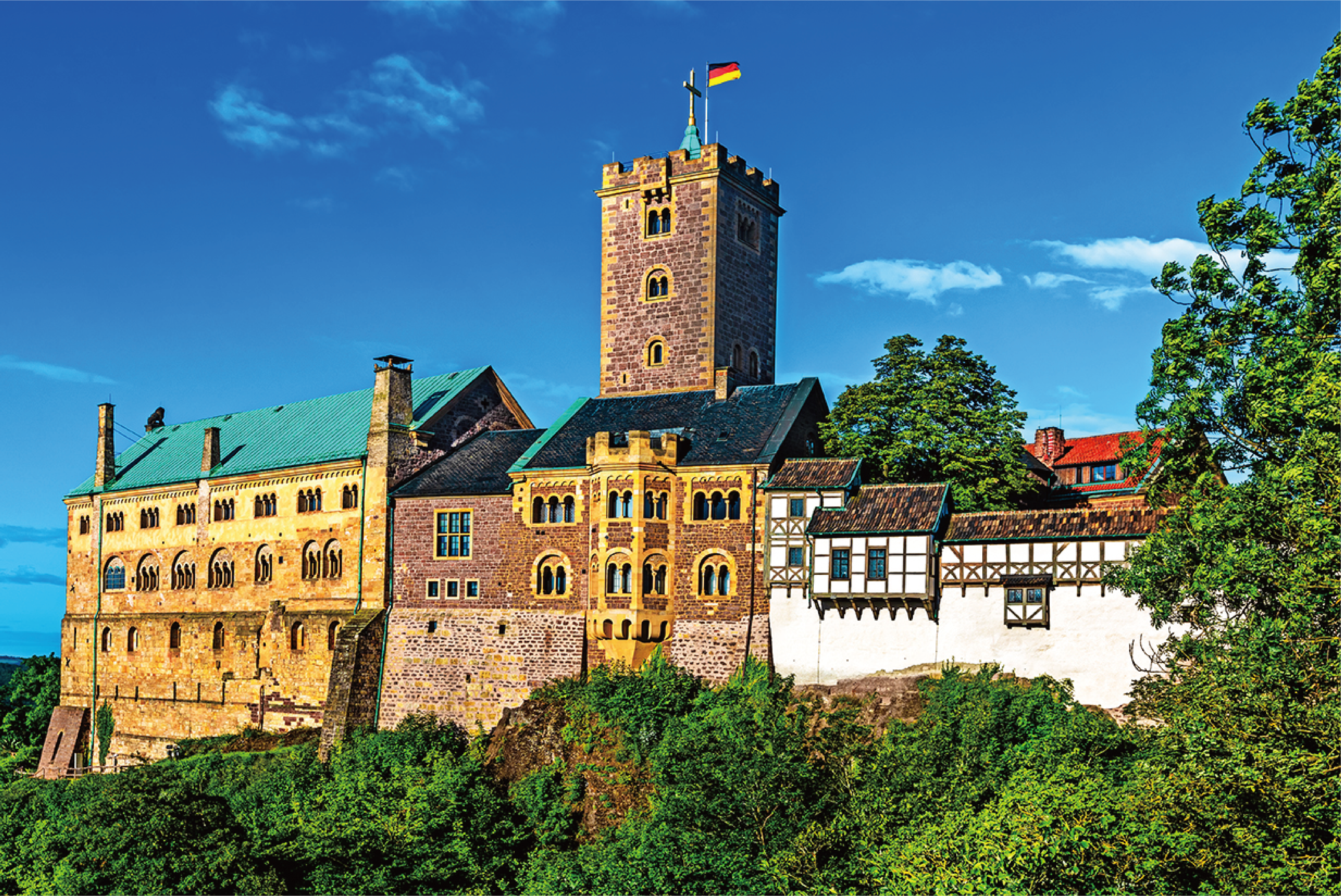 ヴァルトブルク城ワーグナーの《タンホイザー》は、「タンホイザーとヴェーヌスベルク」の伝説と「ヴァルトブルクの歌合戦」の史実・伝説をもとに作られました。中世のミンネゼンガー(宮廷恋愛歌人)たちが歌を競ったヴァルトブルク城は、ドイツ中部テューリンゲン州アイゼナハ郊外の、緑濃い森を一望する山の上に実在しています。13世紀初め頃のこの城には、当時の領主ヘルマン一世に招かれた歌人たちが集いました。タンホイザーを擁護する友人として描かれるヴォルフラム・フォン・エッシェンバッハは当時を代表する有名な歌人です。《タンホイザー》第2幕の歌合戦は、城の3階部分にある〈祝典の間〉が舞台です。ワーグナーは彼の全ての作品の台本と音楽を手がけており、この《タンホイザー》も例外ではありません。彼は台本を構想していた1842年に初めてこの地を訪れています。当時のヴァルトブルク城は、時代ごとの改修を経て中世の面影を失い荒れ果てていました。ドイツ国民統合の象徴としてヴァルトブルク城が歴史的再建が果たされ〈祝典の間〉が蘇ったのは、《タンホイザー》が1845年にドレスデンで初演された15年後のことでした。