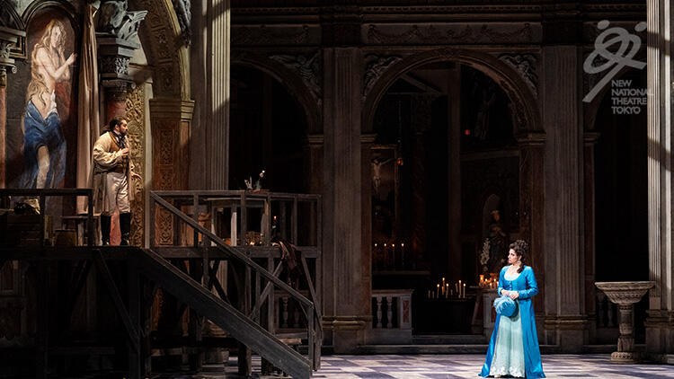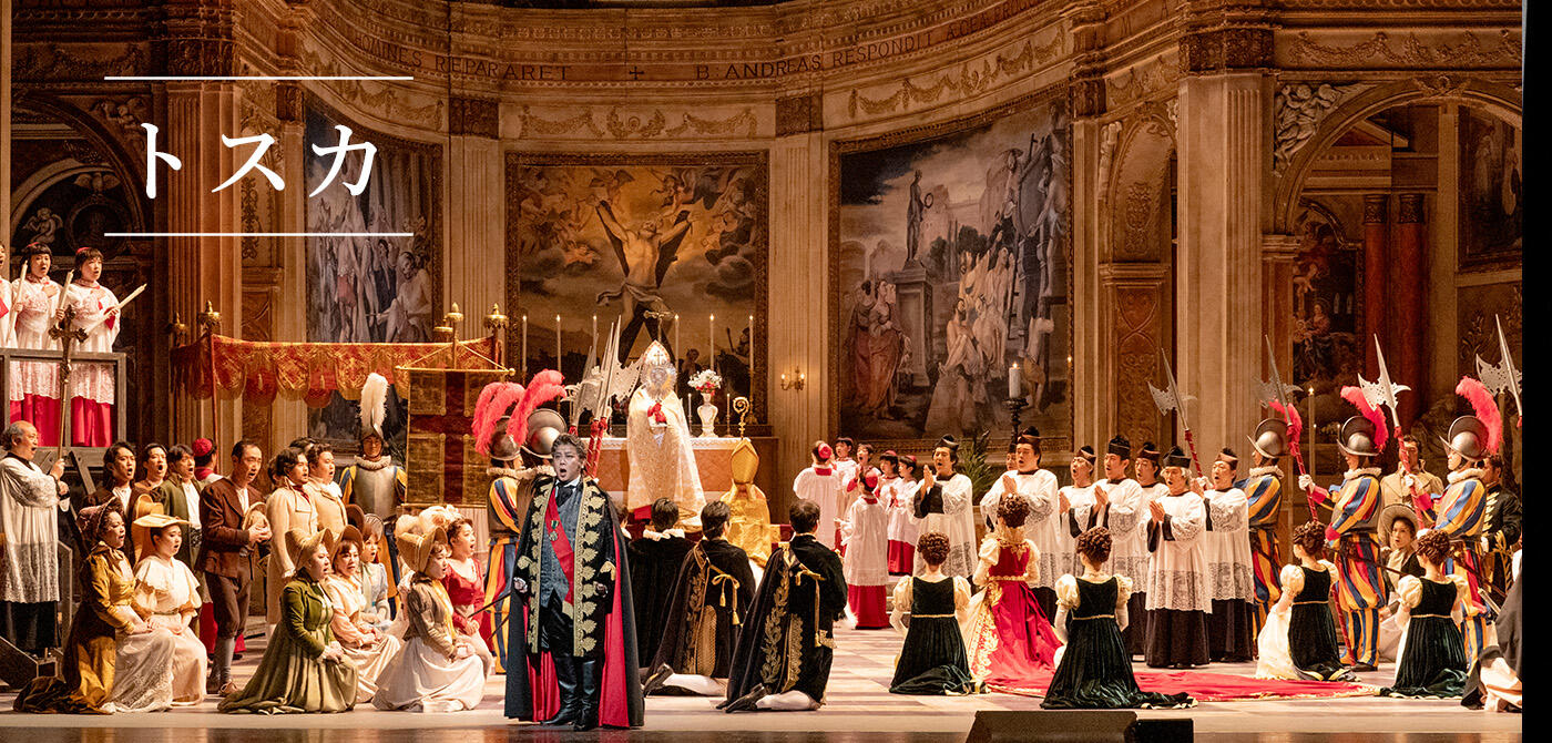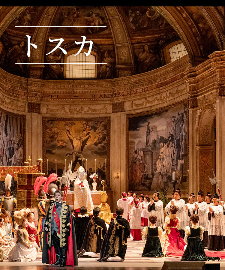 【第1幕】旧王制派の警視総監スカルピアの恐怖政治下の1800年6月17日のローマ。共和派で画家のカヴァラドッシが教会でマリア像を描いていると、アンジェロッティが脱獄して逃げてくる。カヴァラドッシは再会を喜ぶが、恋人のトスカが来るので、慌てて彼を礼拝堂に隠す。トスカは描きかけのマリア像が侯爵夫人にそっくりだと嫉妬するが、カヴァラドッシになだめられ教会を去る。彼らが隠れ家に向った後、スカルピアが教会にやってくる。脱獄犯をかくまった証拠をつかんだスカルピアは、嫉妬深いトスカを利用して二人の行方を突きとめようとする。