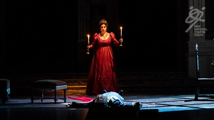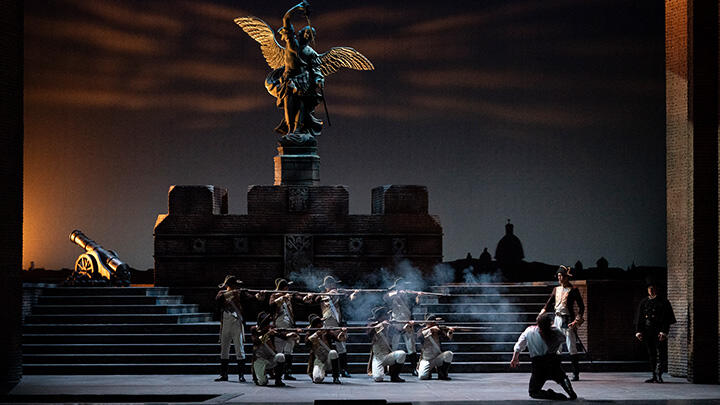 【第3幕】牢獄のカヴァラドッシのもとをトスカが訪れ、スカルピアを殺したこと、刑は見せかけであることを説明。死刑執行のときを迎える。銃声が鳴り響き、地面に崩れ落ちるカヴァラドッシ。トスカが駆け寄ると、彼は絶命していた。そのときスカルピア殺害も発覚し、追手の声が迫る。追い詰められたトスカは、聖アンジェロ城から身を投げる。