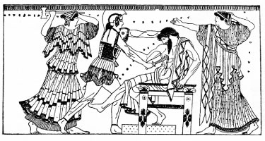 もう1つの出来事はトロイア出陣時の天候である。父アトレウスの後を継いで王となったアガメムノンは、ギリシャ連合軍の総大将となる。だが出航準備が整っても、順風は吹かない。出発延期が長引くにつれ人々の苛立ちは募る。ついにアガメムノンは神託の指示どおり、長女イピゲネイアを生贄に捧げてしまう。風は吹き、出陣は叶い、時間はかかったが戦争にも勝った。だが妻のクリュタイメストラは娘を殺した夫を許せない。彼女は利害が一致するアイギストスと情を通じ、戦争から戻った夫を殺して娘の仇を討つ。その7年後、今度は息子のオレステスが姉エレクトラの助力を得て、母とその愛人を殺し父の復讐を遂げる。